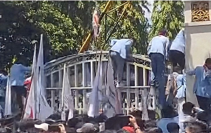 Bahana pos ( Pekanbaru ) – Aksi unjuk rasa oleh Badan Eksekutif Mahasiswa (BEM) Universitas Riau (UNRI) di Kantor Gubernur Riau berlangsung dramatis. Massa aksi berusaha membuka paksa gerbang utama kantor Gubernur, sementara beberapa mahasiswa berhasil mencopot pagar di sisi kiri kantor.