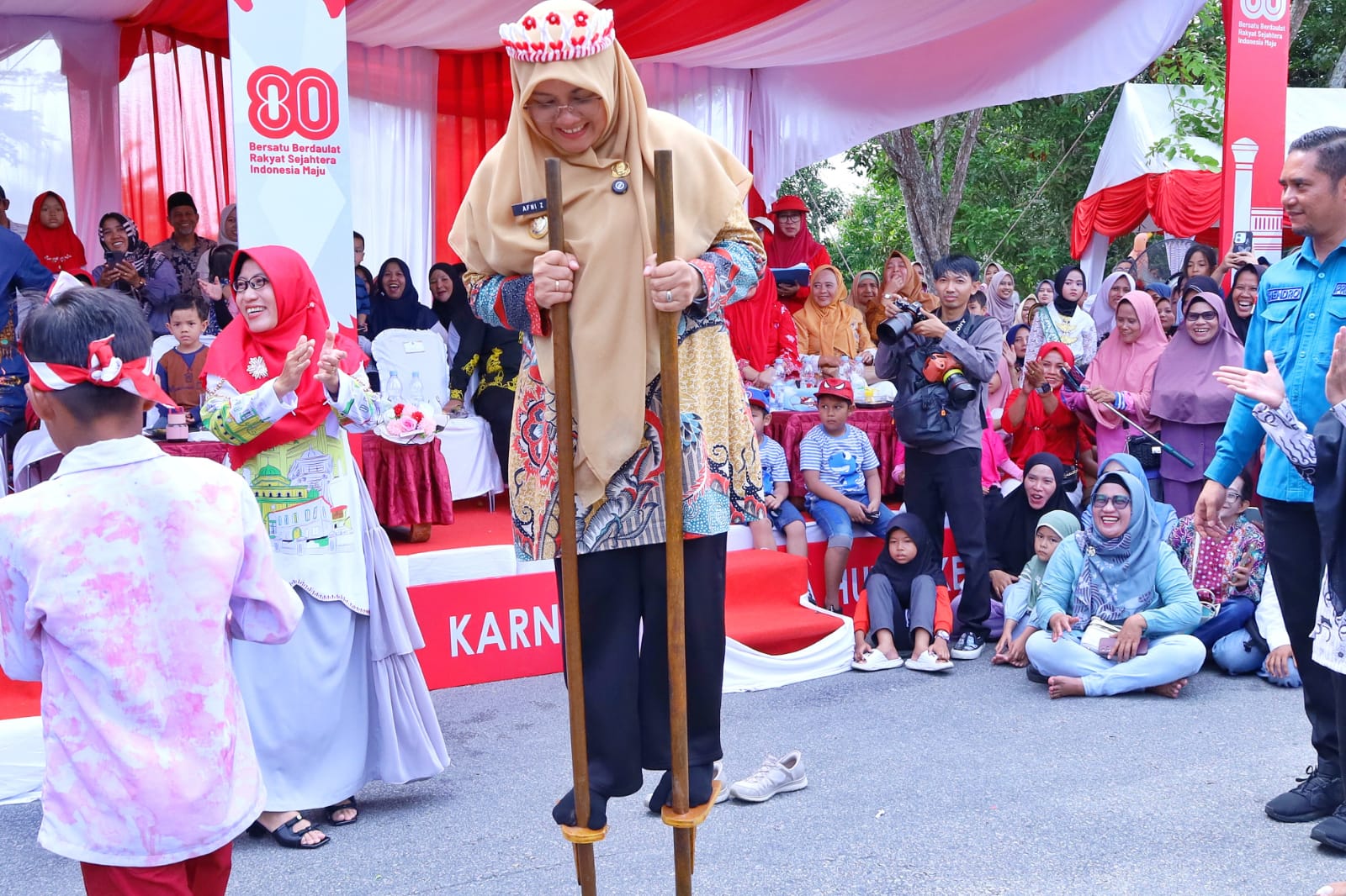 Bupati Siak Afni terlihat senang dan bangga dan mengapresiasi peserta karnaval yang ceria dan bersemangat menampilkan berbagai macam pakaian, dari pakaian adat, seragam dinas maupun profesi, pakaian pejuang, dan lainnya, serta penampilan yang ditampilkan oleh setiap peserta.