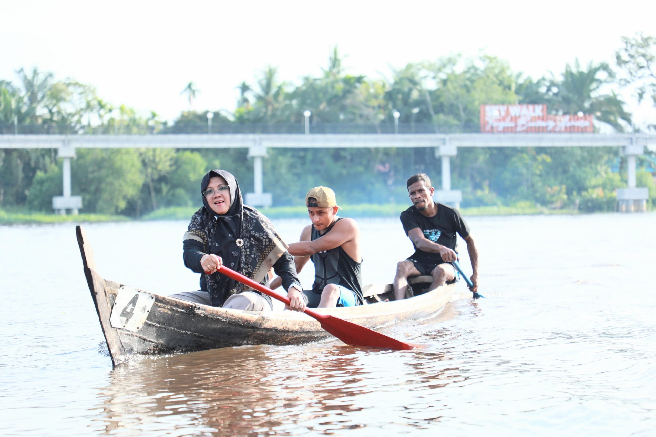Dengan wajah penuh semangat, Bupati Afni yang didampingi 2 orang peserta lomba dayung tradisional, berhasil mendayung sampan menyeberangi sungai Siak.