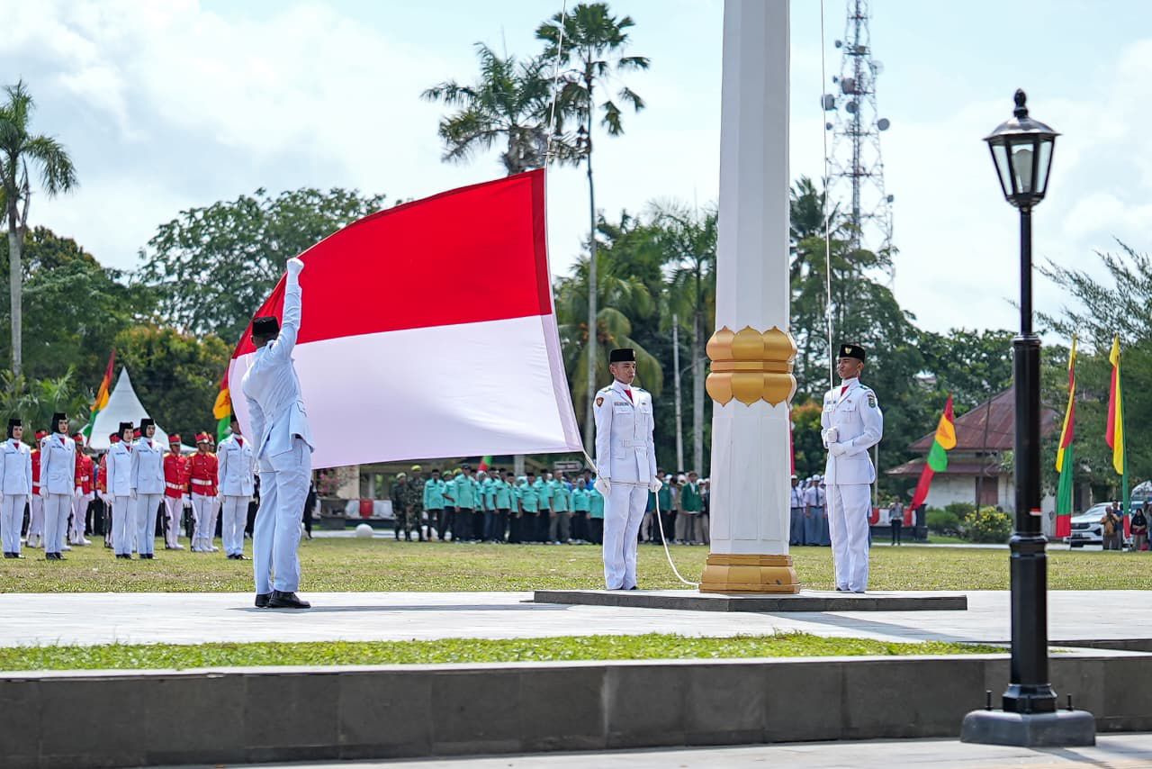 Bahana pos ( Siak ) – Puncak peringatan Hari Ulang Tahun (HUT) RI ke-80 di Kota Siak Sri Indrapura berlangsung meriah. Momen HUT RI ini ditandai dengan pengibaran sang merah putih oleh Pasukan Pengibar Bendera (Paskibraka) Kabupaten Siak.